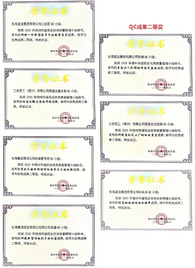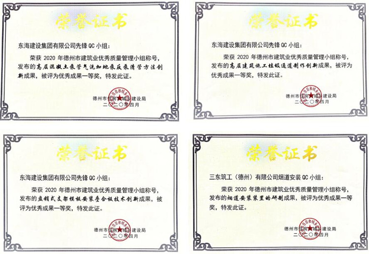 其中,东海建设集团共斩获17项优秀成果奖。东海建设集团QC小组申报的高层混凝土泵管气洗加地泵反泵清管方法创新、高层建筑施工垃圾通道制作创新、盘销式支架模板安装叠合板技术创新成果以及三东筑工(德州)有限公司QC小组申报的烟道安装装置的研制成果共计4项成果获得优秀成果一等奖。
