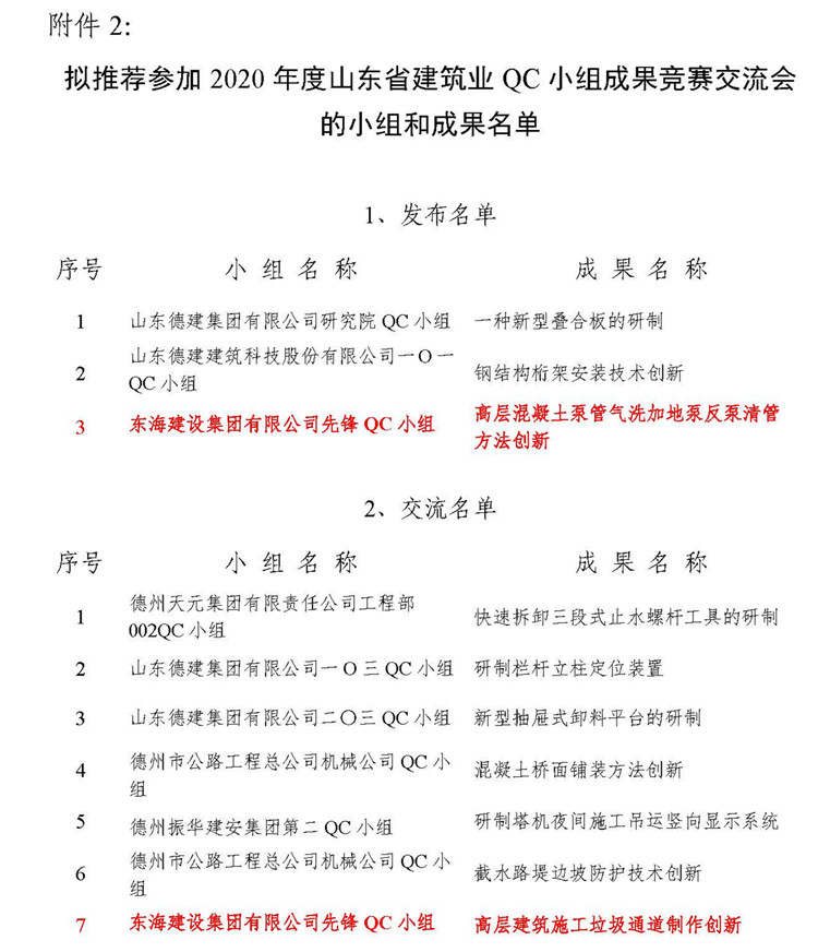 东海建设集团QC小组申报的高层混凝土泵管气洗加地泵反泵清管方法创新、高层建筑施工垃圾通道制作创新成果获推参加2020年度山东省建筑业QC小组成果竞赛交流会。