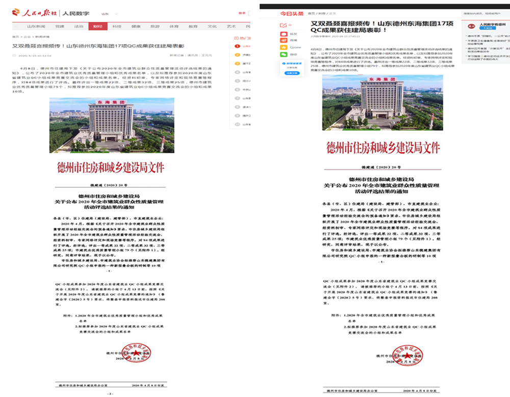 4月8日,德州市住建局下发《关于公布2020年全市建筑业群众性质量管理活动评选结果的通知》,公布了2020年全市建筑业优秀质量管理小组和优秀成果名单,以及拟推荐参加2020年度山东省建筑业QC小组成果竞赛交流会的小组和成果名单。经资料初审、专家网络评定和现场竞赛等程序,对84项成果进行了评选。最终评出一等成果22项、二等成果32项、三等成果25项,市建筑业优秀质量管理小组79个,拟推荐参加2020年度山东省建筑业QC小组成果竞赛交流会的小组和成果10项。今日头条、人民日报社等媒体进行报道。