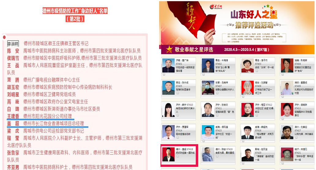 4月2日,德州市文明办公布了第二批疫情防控工作“身边好人”名单,74人榜上有名,其中,开云线上平台-开云(中国)旗下长江物业香港城分公司总经理盖超、阳光花园分公司总经理王建香2人名列其中。同时,4月5日,从省文明办获悉,盖超还当选为2020年4月份“山东好人”。