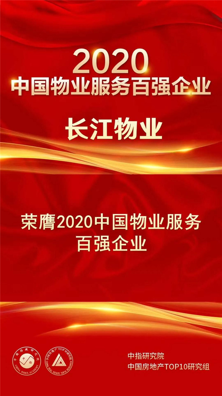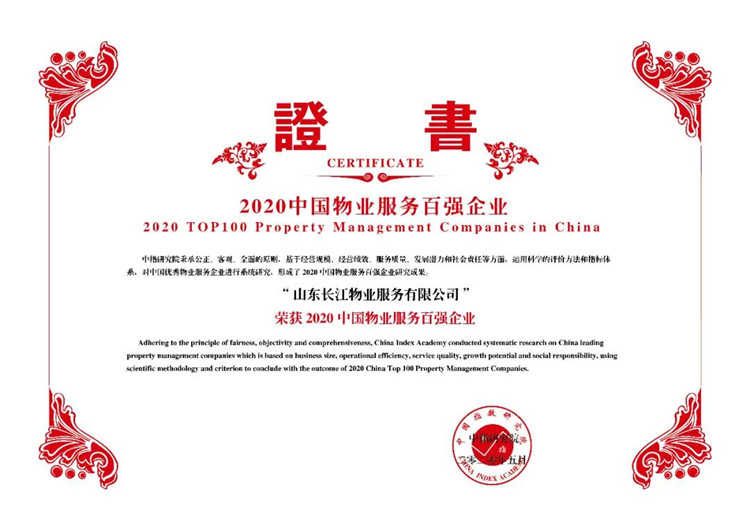 山东长江物业服务有限公司凭借高品质服务荣膺“2020中国物业服务百强企业”殊荣。人民日报社、今日头条、奏嘛新闻、德州新闻网、中指研究院、德州晚报、搜狐焦点、德州乐居等媒体进行相关报道。