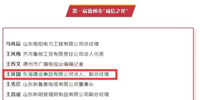 7月17日,由德州市委宣传部、市文明办、市发改委联合举办的第一届德州市“诚信之星”评选活动结果正式公布。其中,东海建设集团有限公司副总经理王延国榜上有名。