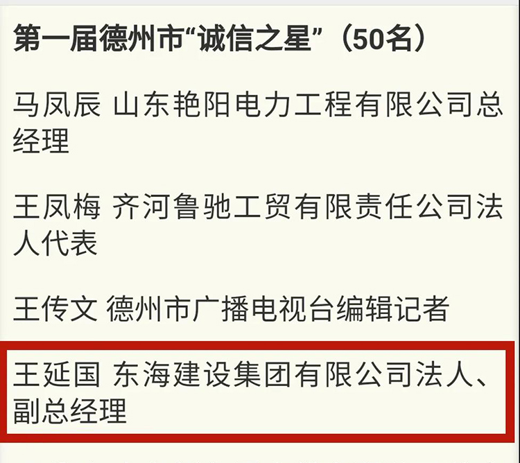 8月21日,德州市发改委正式公布了德州首批“信用红名单”,42名援鄂医疗队员及50名首届“诚信之星”入围。其中,东海建设集团有限公司副总经理王延国榜上有名。