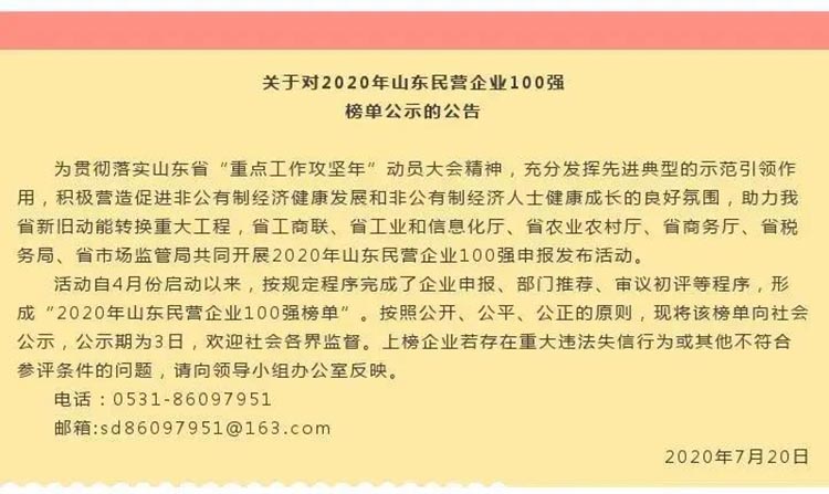 开云线上平台-开云(中国)再次荣登2020年山东民企百强榜单