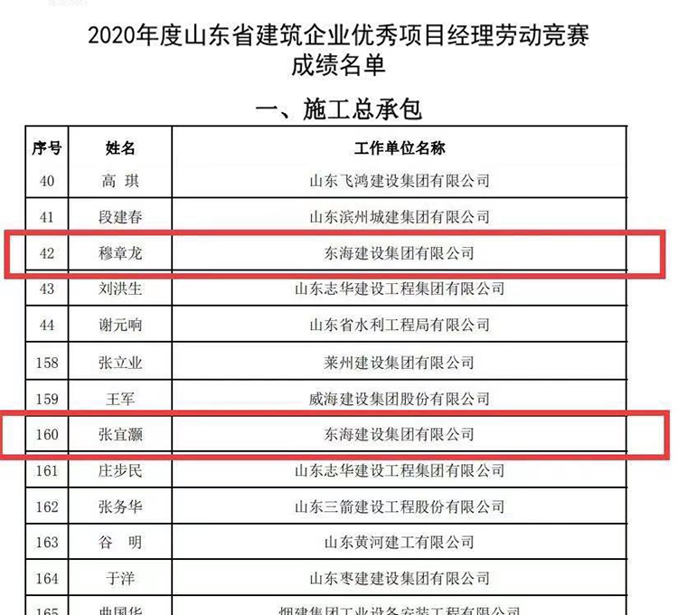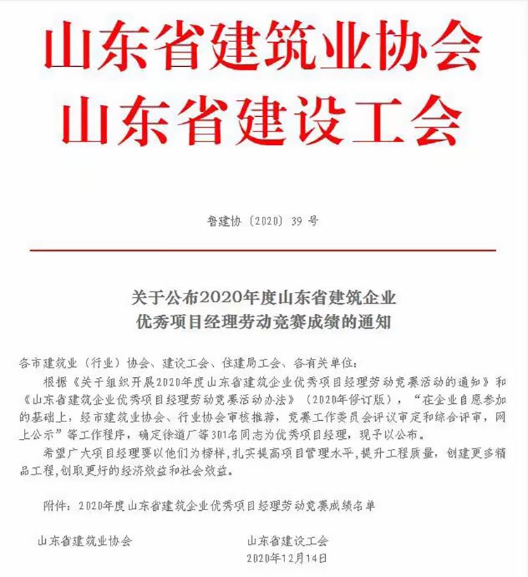 12月14日,山东省建设工会、山东省建筑业协会下发《关于公布2020年度山东省建筑业企业优秀项目经理劳动竞赛成绩的通知》,东海建设集团穆章龙、张宜灏两人被授予“山东省建筑业企业优秀项目经理”称号。“山东省建筑业企业优秀项目经理”每年评选一次,是山东省建筑行业项目经理的最高荣誉,旨在鼓励受表彰人员再接再厉,发挥引领示范作用,创建更多精品工程。