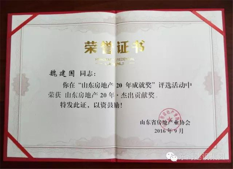 奖项在全行业内开展,不限于会员。全省共推荐上报杰出贡献奖34人,基本涵盖了各地最优秀的房地产企业家。经专家评审,最终有10名房地产企业家获得“山东房地产20年·杰出贡献奖”。魏建国董事长以其在房地产业的卓越成就,高分当选,并成为德州市唯一当选的房地产企业家。 魏建国带领他的团队,自经营房地产业以来,始终秉持 “高起点规划、高品位开发、高质量建设”和 “品质等于生命,信誉等于灵魂”的经营理念,通过多年的拼搏奋斗和不断创新,向社会奉献了一大批高档精品楼盘。先后开发建成了“东海·现代城”、“东海·天玉铭城”、“东海·金马商城”、“东海·富贵苑”、“东海·巴黎城”“、东海·香港城”等十几个项目,本地还有“德州壹号院”和“东海·凤凰城”两个项目40多万平即将开工建设。东海在立足德州,深耕本土的同时,积极实施走出去战略,与成都永利融投资有限公司联合开发的上海闵行项目于今年8月份正式签约。所有建成楼盘,均得到了政府、业界专家和广大业主的一致好评。东海地产先后创造了德州同行业40多项第一,许多都是填补了德州历史的空白。“东海·巴黎城”是德州首个荣获国家行业最高奖“广厦奖”和2A级住宅小区项目。“东海·香港城”在住建部专家验收后称,可与一线品牌开发企业的产品相媲美,在获得“广厦奖”候选项目同时,又被评为3A级住宅小区。