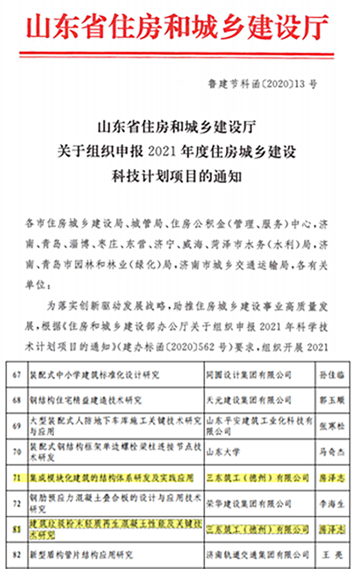 2020年末,山东省住房和城乡建设厅公布了2021年度住房城乡建设科技计划项目名单,三东筑工申报的两项科技计划项目获批立项,分别为“集成模块化建筑的结构体系研发及实践应用”和“建筑垃圾粉末轻质再生混凝土性能及关键技术研究”。