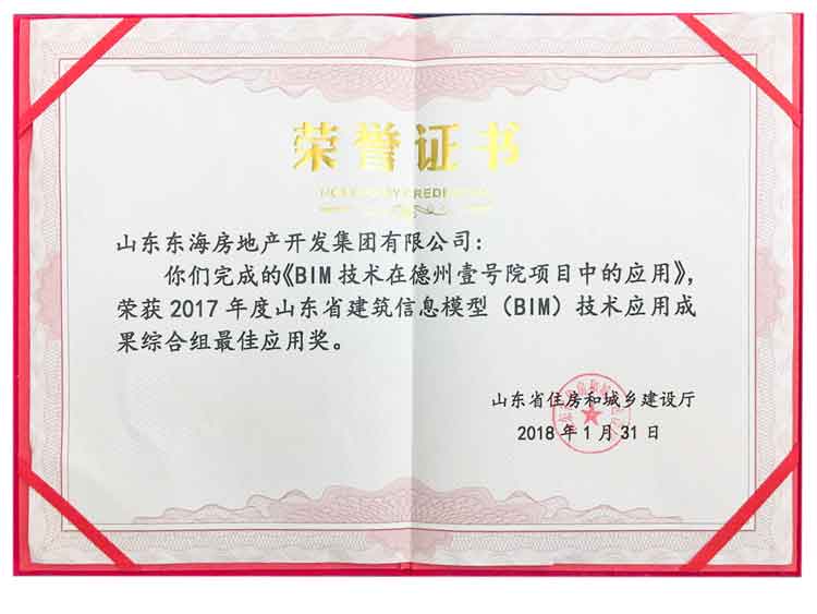 2018年5月10日,山东省BIM技术应用试点示范项目报告会暨BIM技术应用发展论坛在威海市顺利召开,省住房城乡建设厅副厅长、党组副书记李兴军同志委托总工程师顾发全同志出席会议并讲话。省住房城乡建设厅和各市住建局有关负责人、联盟成员单位代表等共300多人出席了大会。在本次会议中各申报单位从不同的角度汇报了各地市试点示范项目的BIM应用情况。东海开发集团主导的《BIM技术在德州壹号院项目中的应用》,荣获2017年度山东省建筑信息模型(BIM)技术应用成果综合组最佳应用奖。
