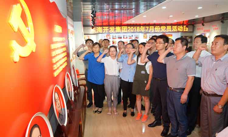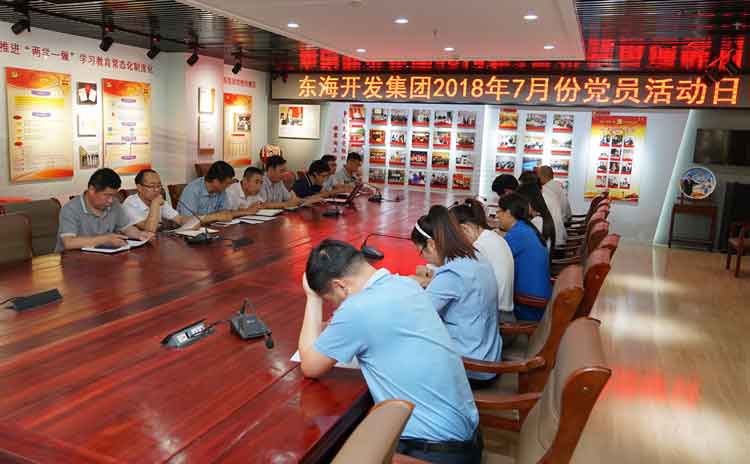 7月9日,东海开发集团党支部7月份党员活动日活动在东海大厦党员活动室召开,全体党员以集体宣誓的方式重温入党誓词。在鲜红的党旗下,全体党员举起右拳,庄严宣誓。此次党员活动日,让党员重温入党宣誓时的庄严承诺和坚定决心,在党旗下接受心灵的净化和洗礼,切实发挥共产党员的先锋模范作用,永葆共产党员的政治本色。