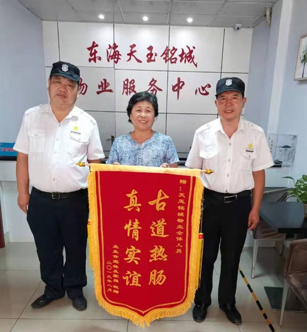 8月14日,天玉铭城物业服务中心收到了15号楼薛阿姨送来的一面“古道热肠,真情实意”的锦旗,以表示对天玉铭城全体工作人员感谢。