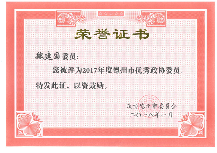 魏建国带领他的企业,为促进地方经济和社会各项事业发展作岀了重要贡献,各级党委政府和社会各界也给予了他崇高的荣誉。他先后荣任省政协委员、省总商会副会长和巿政协常委等多项社会职务,并先后荣获山东省优秀中国特色社会主义事业建设者、全省建筑业先进个人并记三等功、山东省劳动模范、德州市优秀政协委员、德州市诚实守信道德模范等荣誉。