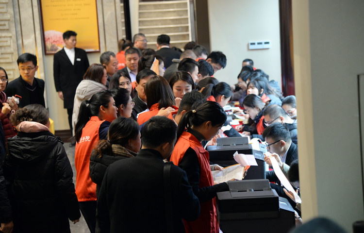 负责接待的现场工作人员一刻未停,热情引导前来购房的来宾。到场的购房者们聚成一团,或从容优雅,或迫不及待,等待着激动人心的时刻到来。