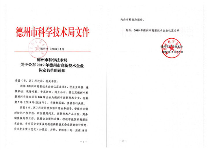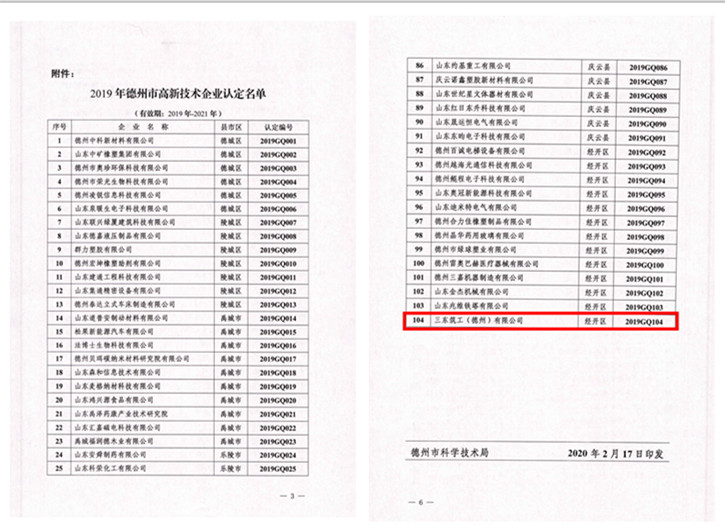 近日,德州市科技局公布了《2019年德州市高新技术企业认定名单》。根据《德州市高新技术企业认定办法》,经德州市高新技术企业认定管理机构组织企业申报、逐级审核、现场考察、专家评审、网上公示等程序,最终,三东筑工(德州)有限公司顺利通过德州市高新技术企业认定。