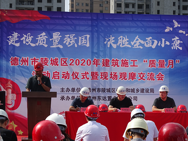 9月16日上午,陵城区2020年建筑施工“质量月”活动启动仪式暨现场观摩交流会在东城壹号院项目隆重举行。此次“质量月”活动由陵城区住建局和东海建设集团201项目部联合举行,旨在进一步加大“质量月”的宣传力度,扩大影响,助推员工思想重视。陵城区质监站站长张明友,副站长林尊礼、祝佳宇,东海建设集团二公司总工程师窦红利、陵城区优秀施工企业杰出代表共100余人参加。